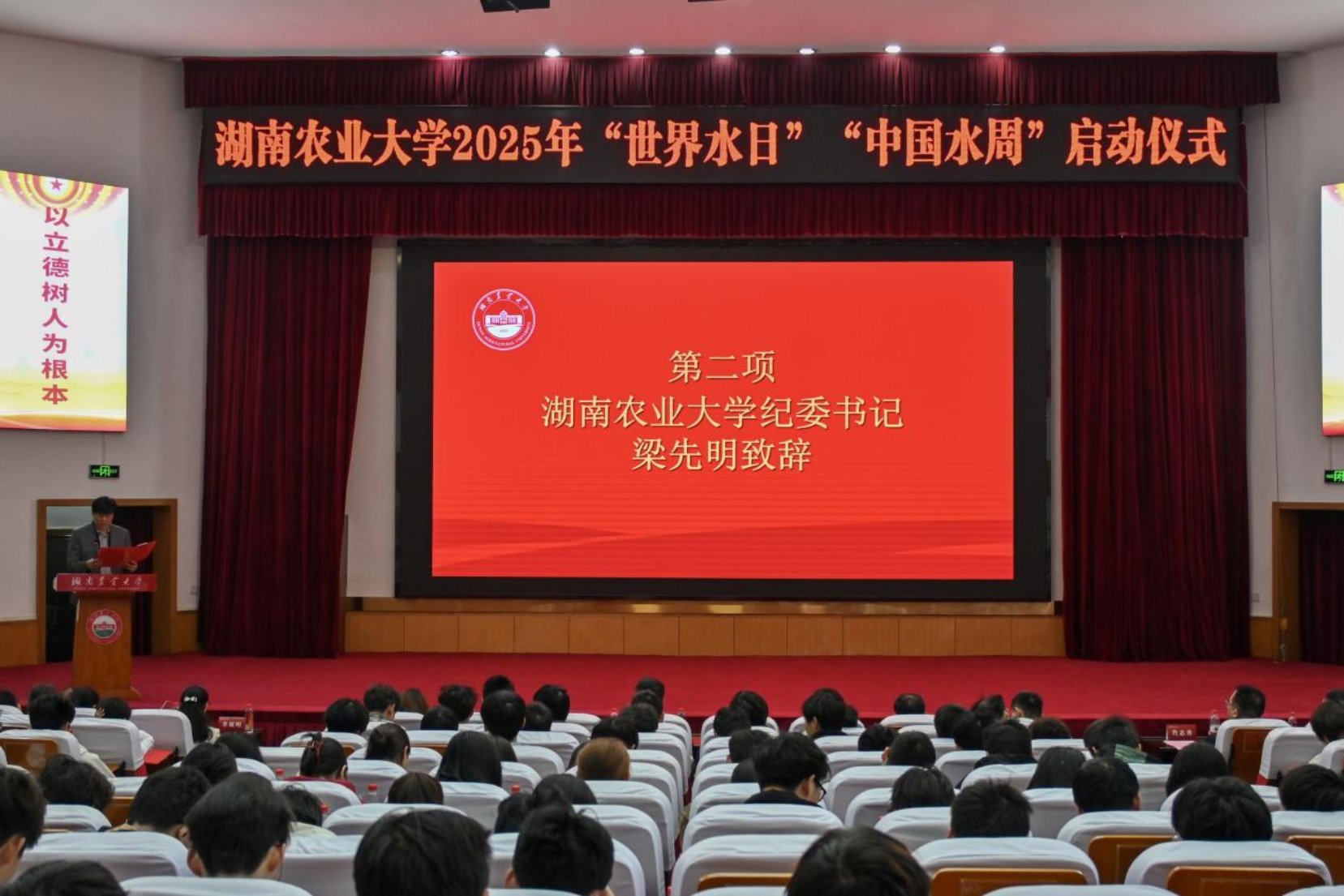 活动在聚焦全球水资源现状的宣传视频中拉开帷幕,通过震撼的视觉呈现引发师生对节水护水的深刻思考。梁先明书记在致辞中强调:"作为农业院校,要将节水理念深度融入人才培养体系,培养具有生态自觉的新时代农业人才。"他号召师生从实验室节水实践、中水回用系统建设、护水科技研发等具体行动入手,争当节水先锋。