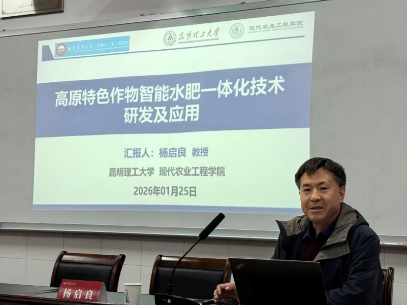 25 日下午,杨启良在第八教学楼南 216 会议室作报告,立足国家战略与西南农业实际,分享了团队在云南的科研成果,详解三七、小粒咖啡等作物水肥调控规律及节水抗病机制,展示了自主研发的智能水肥一体机、无人机遥感监测系统等装备应用成效,强调该技术对高原农业“节水、减肥、减排、提质、增效”的关键作用。互动环节,师生围绕作物微生物调控及装备适配性等问题深入交流。